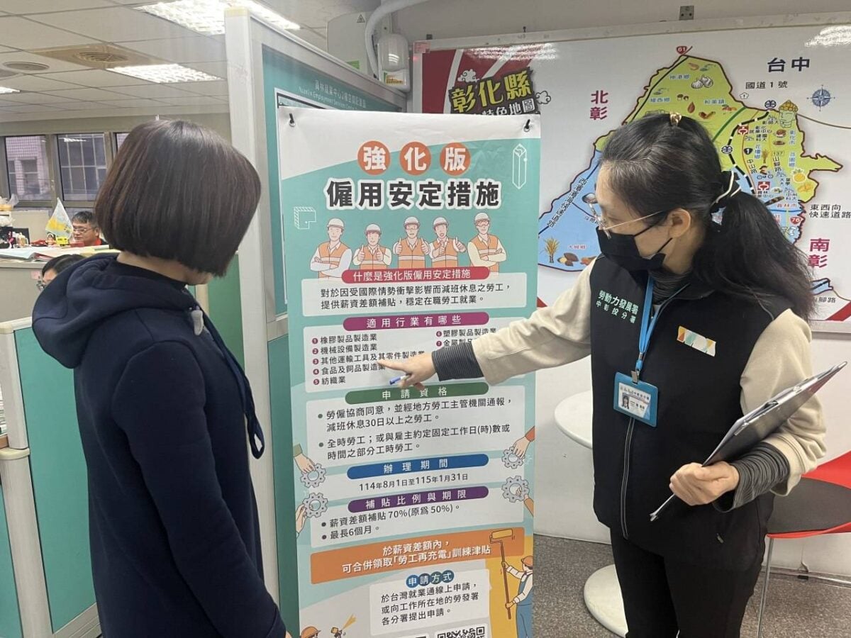 中彰投分署指出,考量國際情勢遞延效應仍在,部分傳統產業仍面臨營運壓力,且正值產業復甦與轉型關鍵期,因此轄下就業中心積極推動強化版「僱用安定措施」,該措施適用對象涵蓋「食品及飼品製造業」、「紡織業」、「橡膠製品製造業」、「塑膠製品製造業」、「金屬製品製造業」、「電力設備及配備製造業」、「機械設備製造業」、「汽車及其零件製造業」及「其他運輸工具及其零件製造業」等9大行業。