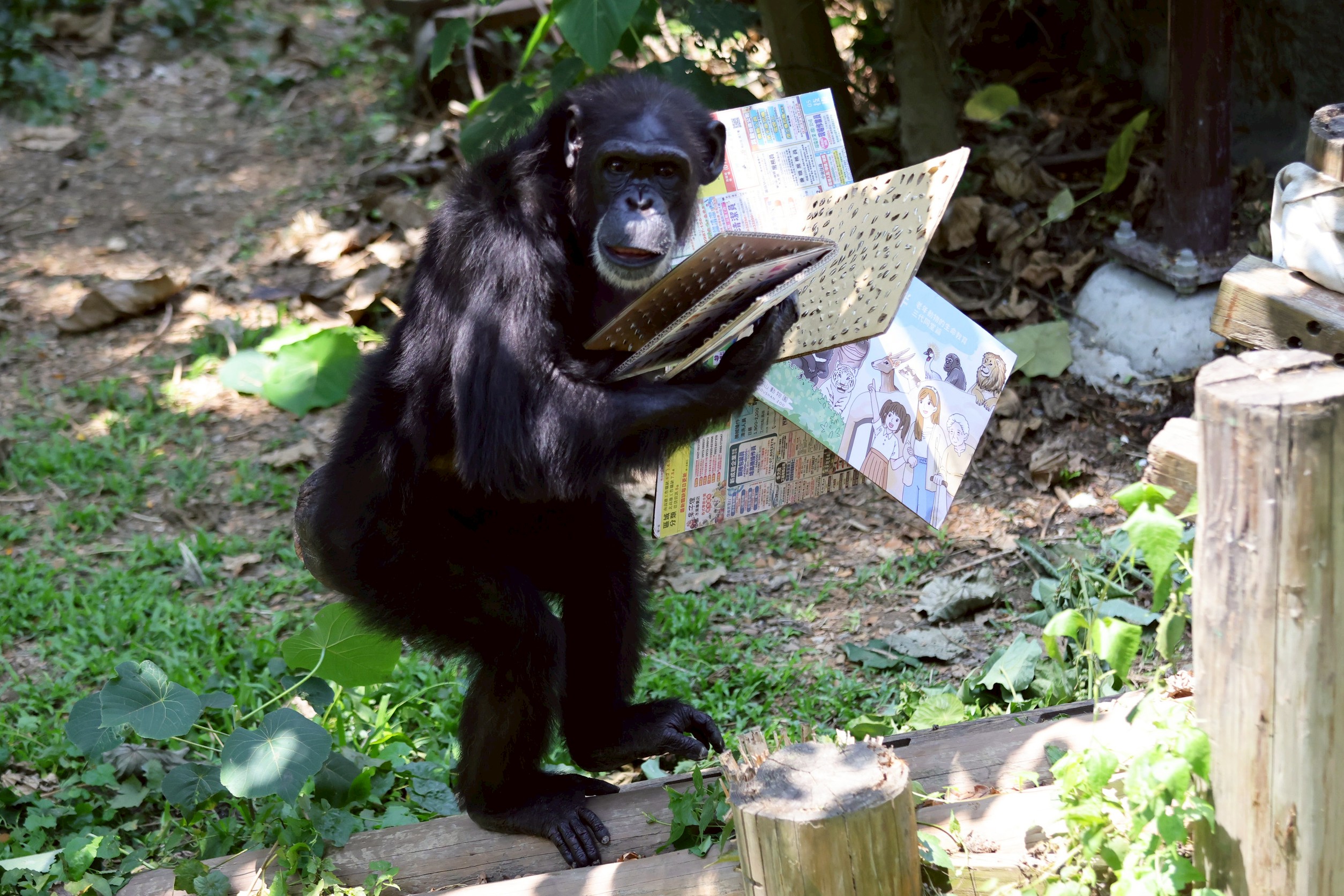 ↑圖說:黑猩猩透過尋找、翻頁、撕開書頁等過程,才能享用書中驚喜。(圖片來源:高雄市觀光局提供)