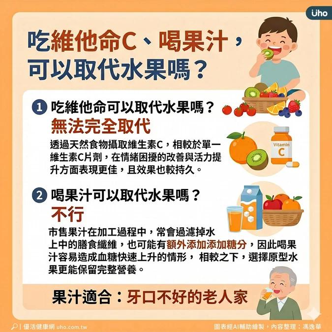 台灣兒童感染症醫學會常務監事、林口長庚兒童感染科顧問醫師黃玉成表示,維生素與單一營養補充劑無法完全取代天然水果的營養價值,透過天然食物攝取維他命C,相較於單一維他命C片劑,在情緒困擾的改善與活力提升方面表現更佳,且效果也較為持久。