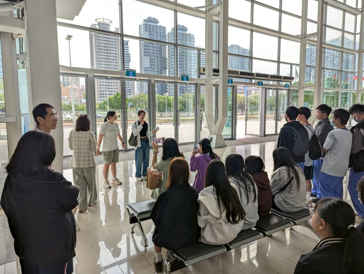 ▲台南海事師生於高雄展覽館大廳聆聽會展系學生專業英文導覽。