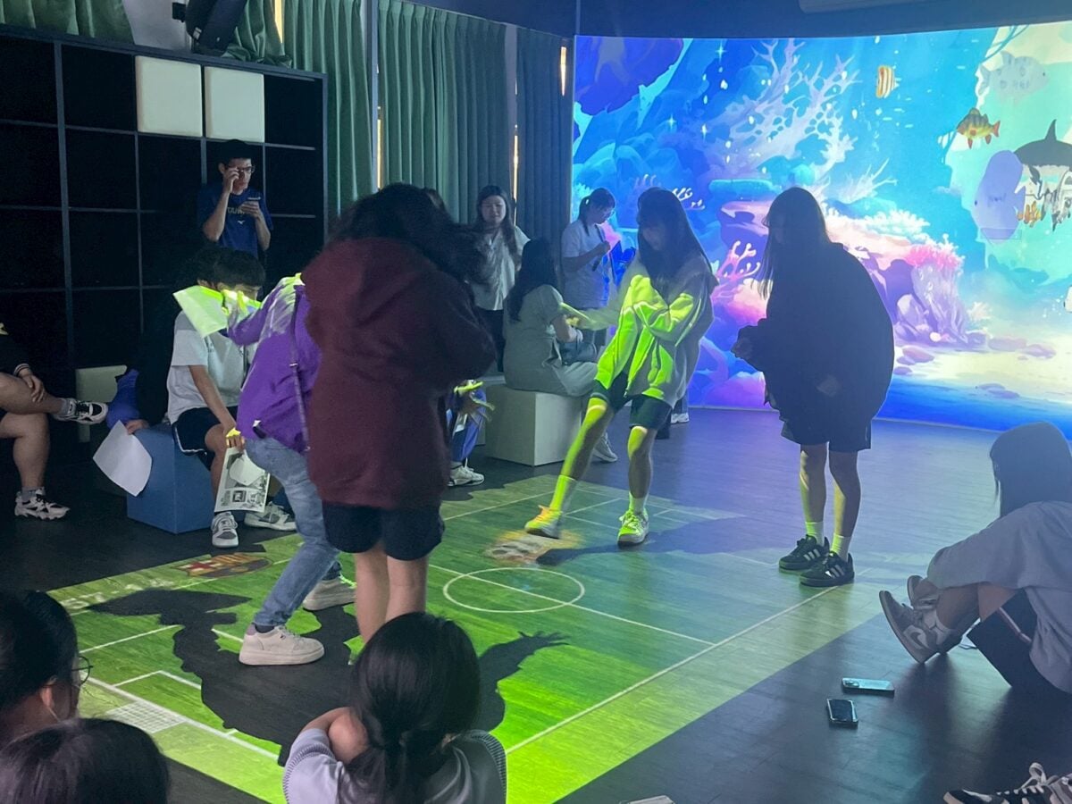 ▲學生於樹德科大會展系「科技會展創新中心」教室中體驗沉浸式互動裝置。