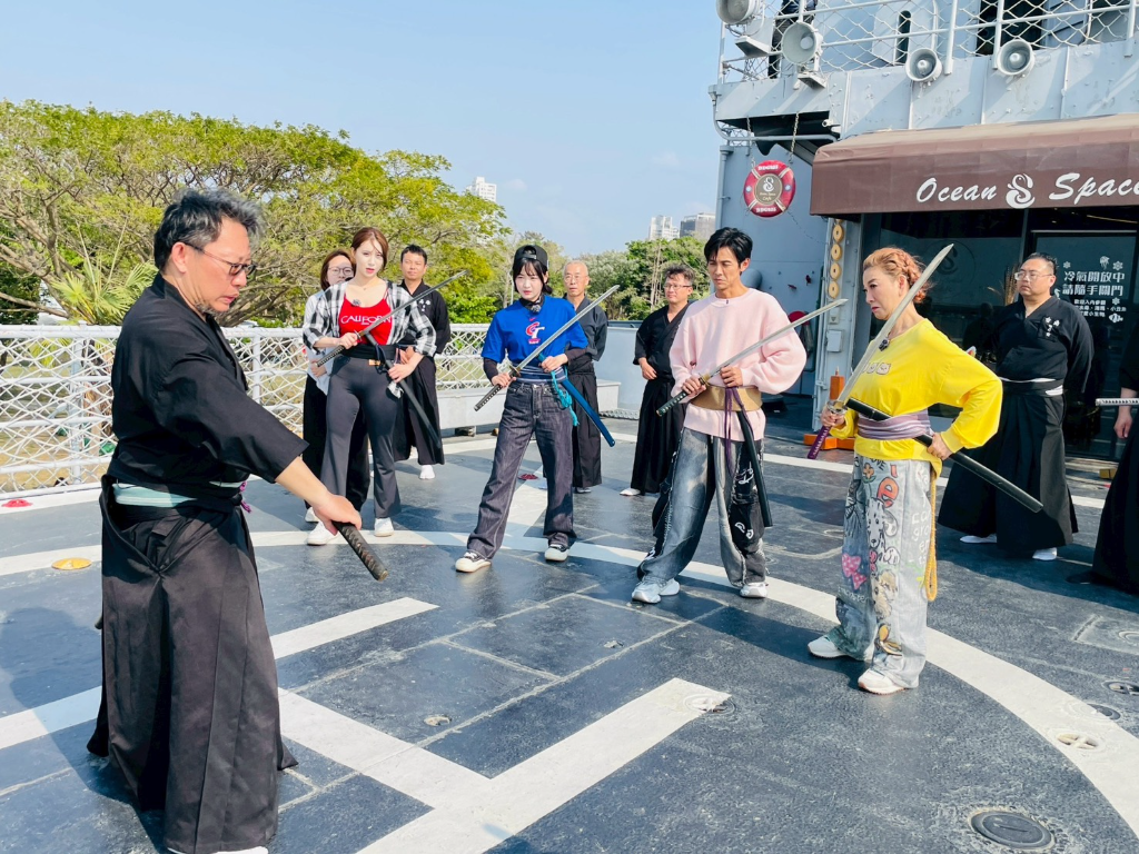 海上挑戰結束後,眾人前往全台第一座軍艦博物館德陽艦園區,拜訪被眾人笑稱是「超劍的男人」的居合道教練吳明典。原來所謂「超劍」,是真的超懂劍術的達人!教練現場示範居合道與拔刀道,瞬間拔刀、揮刀的速度快到讓大家來不及反應,還找來弟子直接以真刀斬斷草席,氣勢驚人。
