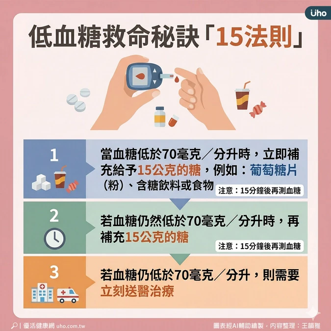 郭雅雯說明,如果臨床上懷疑低血糖時,應立即檢測血糖,以確立診斷,倘若無法檢測血糖,建議視同低血糖處理,可採取救命秘訣「15法則」。