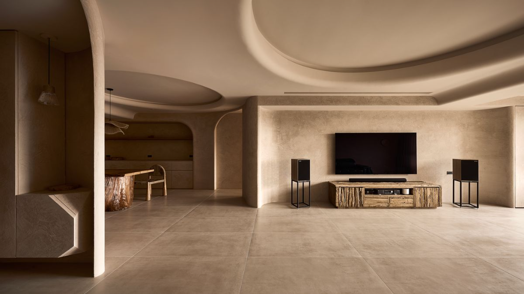 收納規劃亦在不著痕跡之中完成。沿牆整合的系統櫃體與壁龕,透過圓弧語彙與牆面融為一體,使收納隱於形體之中,不破壞整體視覺純度,也讓生活物件各得其所。在整體氛圍上,「漠色琉域」以大地般的漠色為基底,將日常的光景輕柔包覆。光線在粗礫質地與圓弧曲面之間流動,使時間的變化被悄悄放大:清晨的柔光、午後的暖影、夜晚的燈火,都成為空間敘事的一部分。