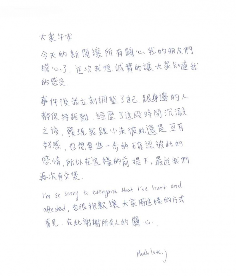 沉寂一段時間後,兩人近期逐步回歸演藝圈,近日兩人又被拍到舊情復燃,吳卓源以手寫信形式表達心境,內容提及面對過往經歷後的反思,以及對這段關係的重新選擇,間接證實復合消息。
