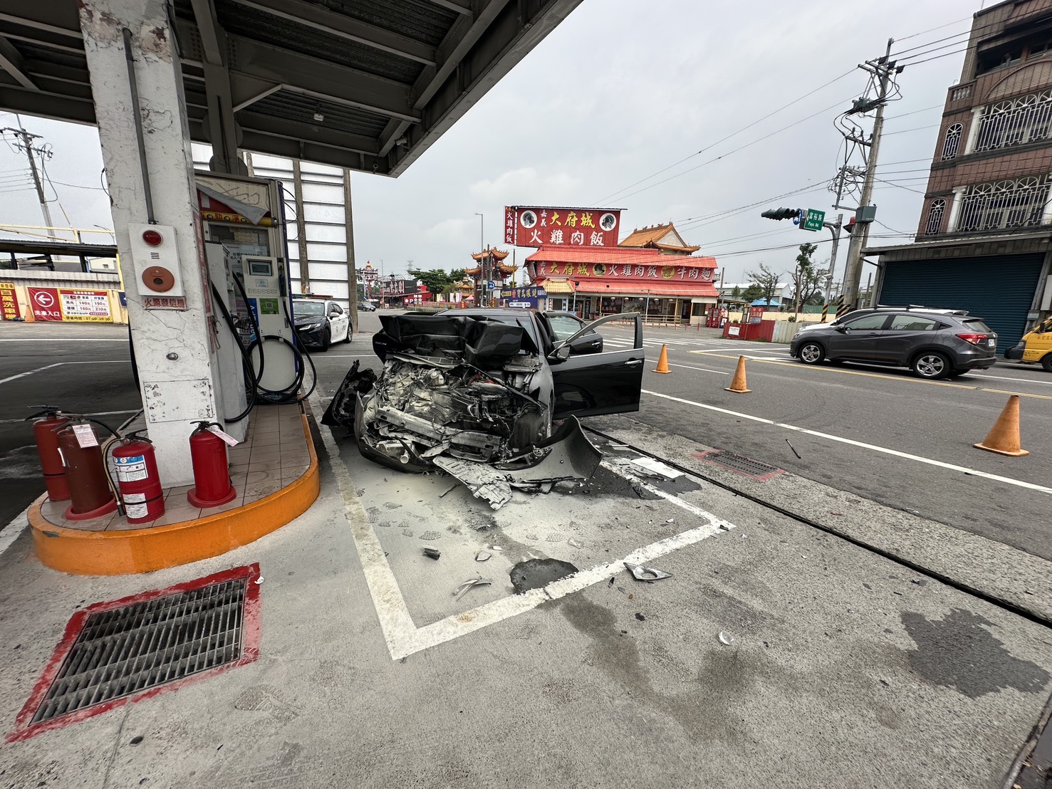 自小客車衝進中埔鄉一處加油站,撞擊正在加油自小客車及加油島收費亭。翻攝畫面