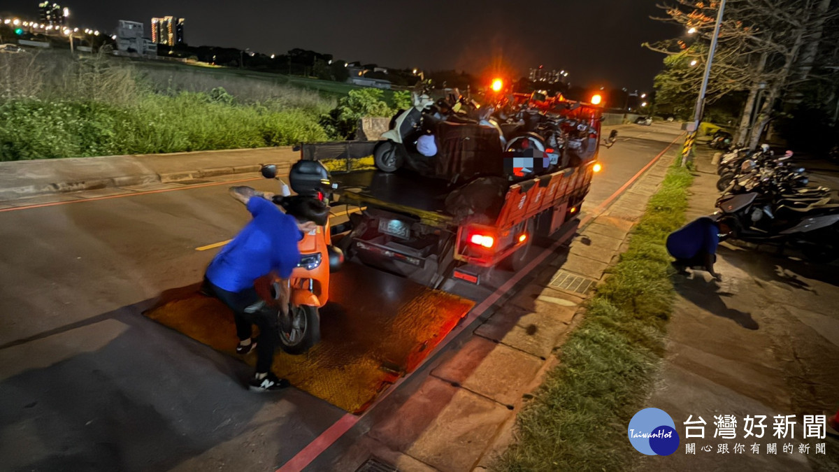 中壢警分局球場賽事強化交通執法,拖吊人行道違停機車維護行人安全。