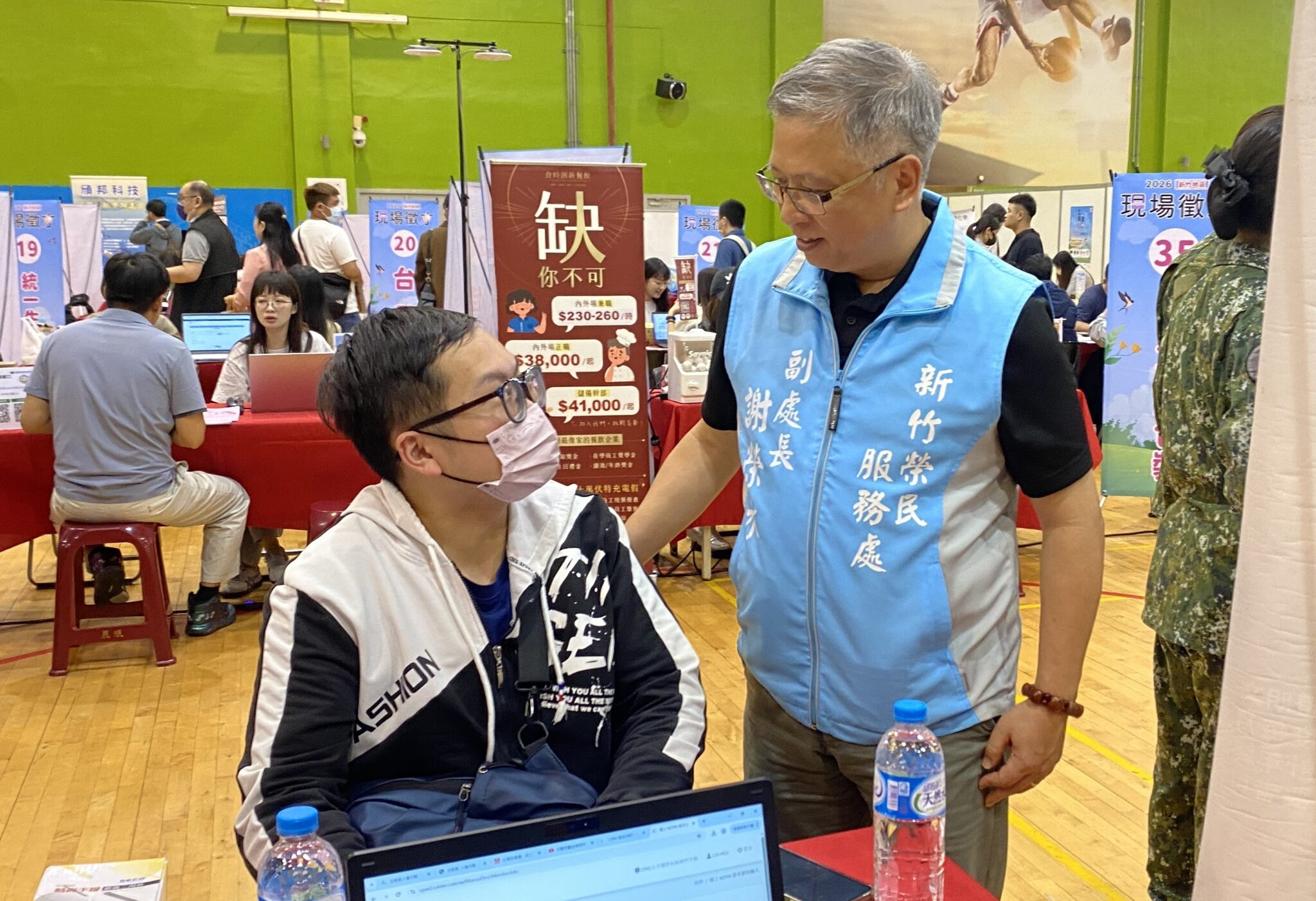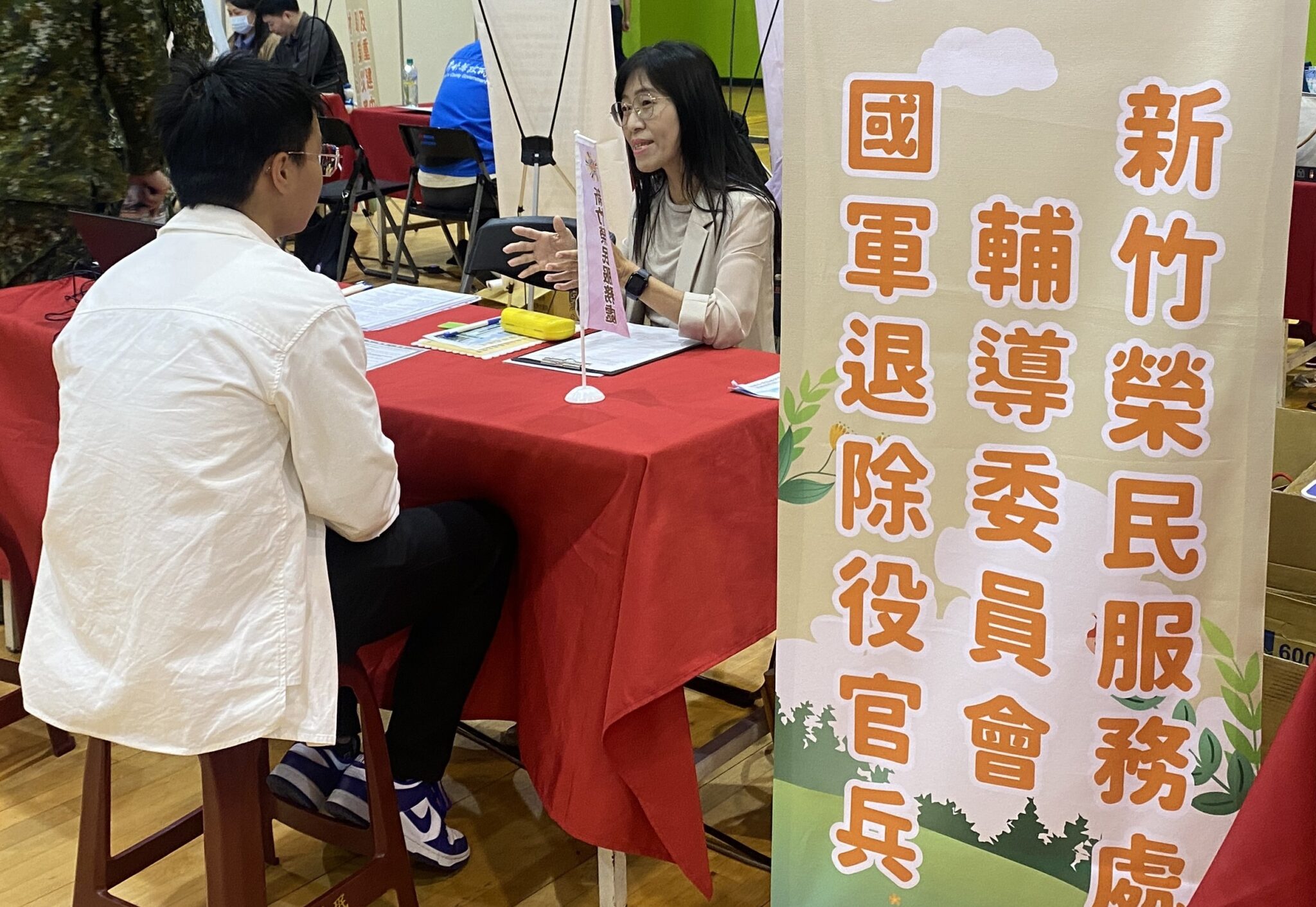 新竹榮服處副處長謝榮水與同仁除了在現場設立服務台,鼓勵退除役官兵積極應徵外,同時也至廠商攤位與企業人資交流互動,退除役官兵具有團隊合作、敬業精神、抗壓性等正向特質,是一群具有即戰力的生力軍,期待企業廠商能踴躍進用退除役官兵,以滿足企業的人才需求。
