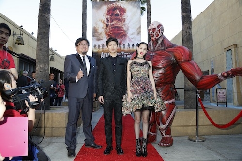 風靡全球的日本動漫作品《進擊的巨人》改編的真人版同名電影,繼創下全球賣出63個國家地區版權紀錄後,前天更趁勝進擊電影聖堂好萊塢,於好萊塢名人大道上著名的埃及戲院(Egyptian Theatre)舉行世界首映。現場人龍綿延數十公尺,觀眾熱情延燒無法擋。導演樋口真嗣、男女主角三浦春馬、水原希子在紅毯上與粉絲零距離打成一片,水原希子更用中文與現場來自台灣的粉絲打招呼,還俏皮獻上飛吻,表達訪台意願!