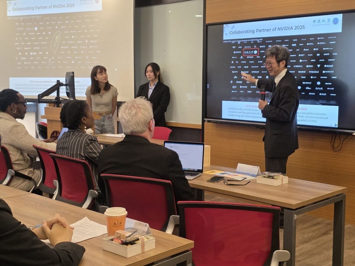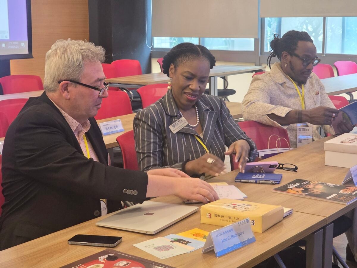 Hines-Gaither博士對「AI輔助教學」表達濃厚興趣,特別關注中原華語文中心自編教材及應華系學生專題作品中AI技術的融合運用,如應華系學生製作的台灣生活華語手冊《用「台」步,走臺灣》即在手繪之外亦運用AI輔助美術設計。資深華語教師林千鈺介紹「翻頁即授課」的線性邏輯教學設計,翻轉主流華語教科書模式,而遵循「視覺、聲音、意義」的順序,強調第一堂課即讓學生開口說,建立學習成就感,並現場教授ACTFL代表團以中文自我介紹,ACTFL理事會理事對此教學法之成效驚豔不已。