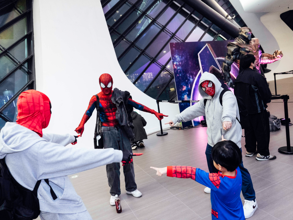 演出開始前,北流大廳與戶外廣場早已被熱情的影迷佔據,彷彿一場大型的漫威盛典。許多Cosplayer精心裝扮,除了大小蜘蛛人同台現身、形成超萌對比,更有影迷戴上閃爍著光芒的「無限手套」穿梭其中,引發陣陣驚呼與快門聲。主辦單位特別設置的大型打卡區更成為全場焦點,氣勢磅礴的「MARVEL」立體大字在燈光下閃耀,與主題背板相互輝映。現場最吸睛的莫過於 1:1 等身比例的「薩諾斯」與「鋼鐵人」氣勢逼人,大批影迷在背板與公仔前大排長龍,紛紛擺出英雄pose合影,熱鬧程度更甚電影首映禮。