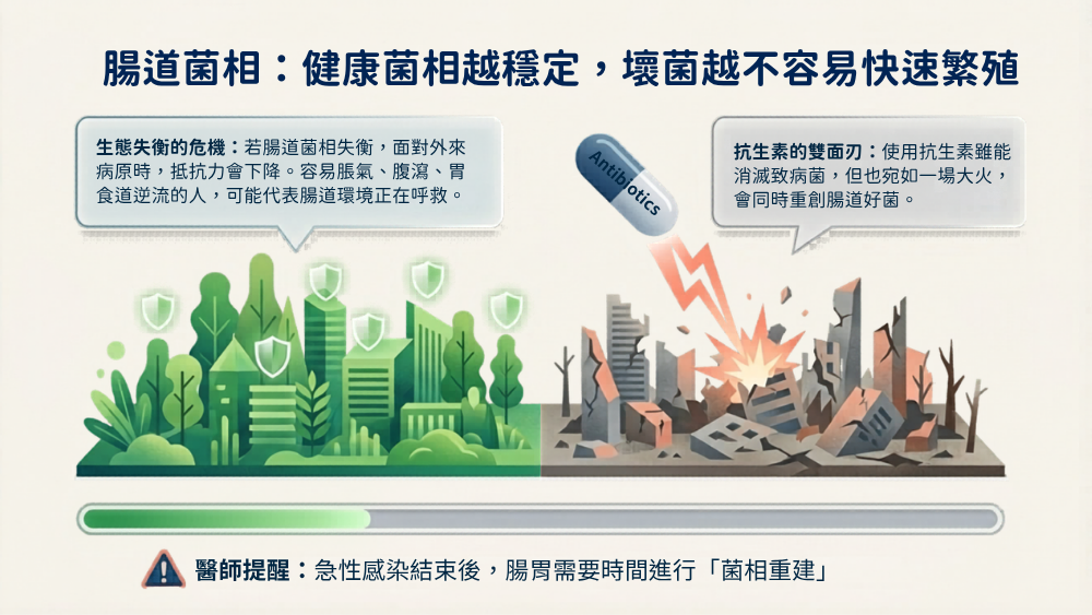 他表示,從臨床觀察來看,容易脹氣、腹瀉、胃食道逆流的人,往往不只是單純「腸胃敏感」,而可能代表消化功能、菌相平衡或腸道環境值得進一步檢視。尤其是曾使用抗生素的人,常見腸道菌相受到干擾,之後即使急性感染結束,腸胃也可能需要更長時間恢復
