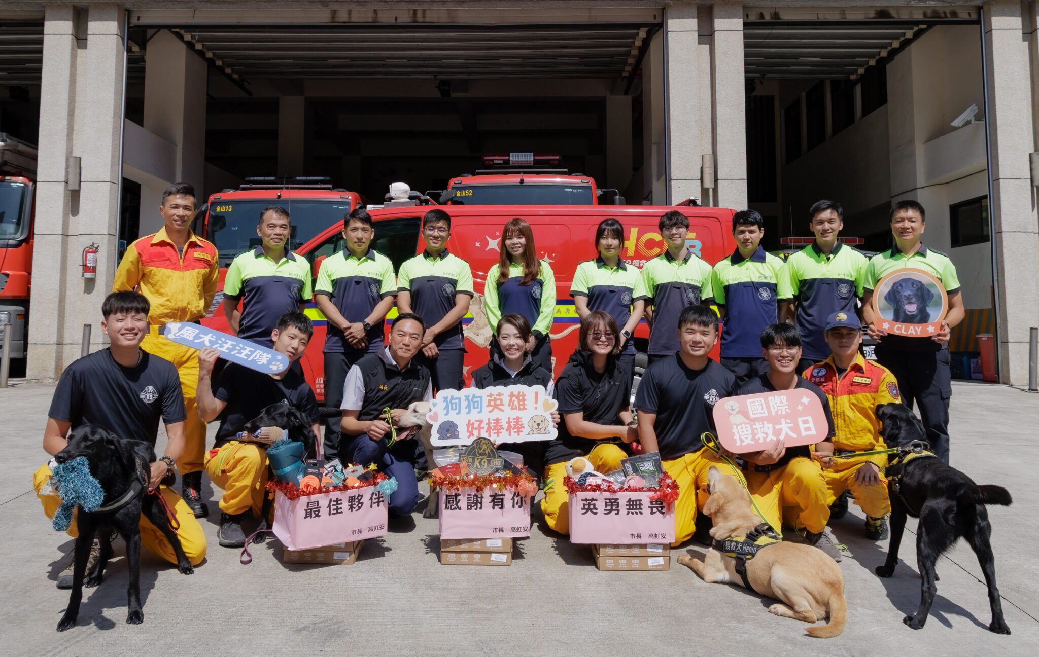 【民眾新聞網方健龍新竹報導】每年4月最後一個週日為「國際搜救犬日」(International Search & Rescue Dog Day),為慰勞長期段入訓練與救災任務的搜救犬及領犬員,新竹市長高虹安今(26)日前往消防局搜救犬訓練場,慰勞辛勤付出的搜救犬與訓練人員,肯定其在各類災害搶救任務中展現的高度專業與絕佳默契,持續守護市民生命安全。