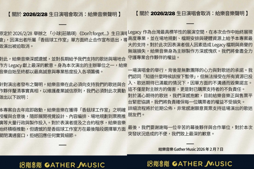 關於取消生日演唱會一事,當時主辦單位發出聲明,表示從去年就開始籌備演出,但小球方卻單方面終止合作,更在最後階段關閉溝通窗口,拒絕回應任何實質細節,也讓他們對提供場地的Legacy感到十分抱歉,無奈說:「我們認同『知道什麼時候該按下暫停』,但無法接受在所有資源已投入、歌迷期待已滿載的情況下,因單方面的不溝通而毀棄諾言,這不僅是對主辦方的傷害,更是對已購票支持者的不負責任。」