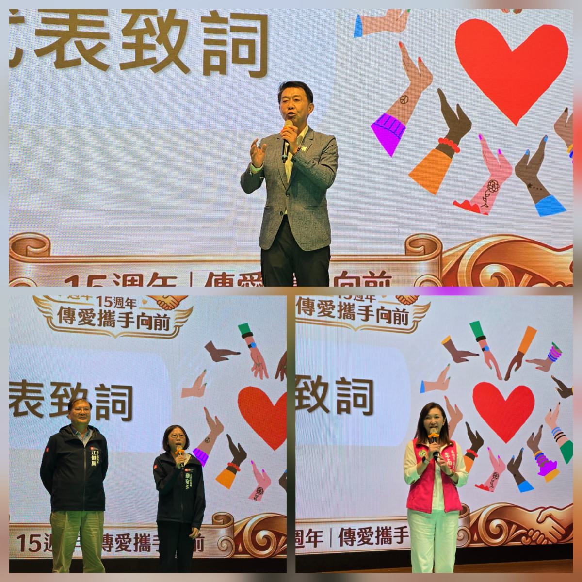 慶典節目另一高潮,是由協會首席顧問林岱樺立委與多位市議員共同推出象徵「15週年里程碑」的巨型慶生蛋糕。在現場會員與表演團體的歡呼聲中齊聲祝賀,這份溫馨的儀式不僅代表了對過去十五年辛勤耕耘的總結,更寓意著未來將持續散播愛的種子。