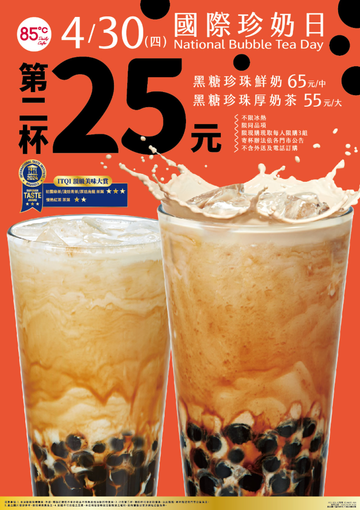 在「國際珍奶日」當天,消費者只需到85℃購買中杯「黑糖珍珠鮮奶」或大杯「黑糖珍珠厚奶茶」,即可享受第二杯僅需25元的超值優惠。這樣的價格換算下來,單杯最低只需銅板價,CP值可謂爆表!例如,大杯黑糖珍珠厚奶茶兩杯特價僅需80元(原價110元),中杯黑糖珍珠鮮奶兩杯特價90元(原價130元),讓消費者在享受美味的同時,也能感受到實惠的價格。