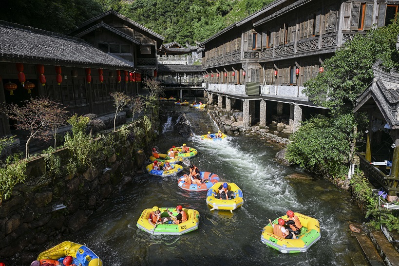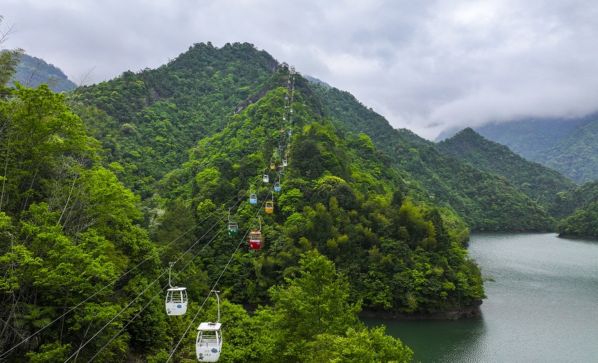 大覺山漂流被譽為“亞洲第一漂”,遊客乘坐橡皮艇,在綠水環流、青山懷抱、古莽蒼源的天然美景中,體驗動靜結合、有驚無險、溝谷縱橫的激流穿行。而乘坐懸崖動車,則是另一種“沉浸式”的賞景體驗。列車沿著山體蜿蜒前行,窗外便是陡峭的崖壁與蒼翠的林海,耳邊是鳥雀歡唱的婉轉,偶爾還能瞥見山間雲霧繚繞,如輕紗般纏繞在枝頭,陽光透過枝葉灑下,在車廂內、石階上形成斑駁的光影,仿佛穿梭在“禪意秘境”之中,每一處景緻都讓人忍不住駐足驚歎。
