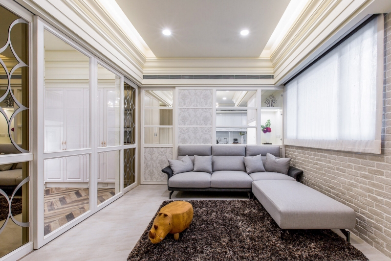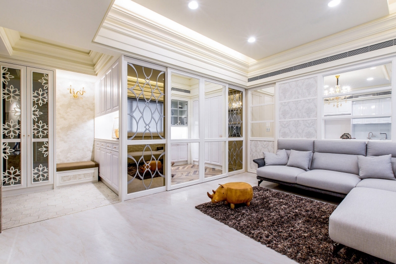 - 雅緻迎賓:玄關鏡面玻璃結合金屬雕飾門片,古典與通透交織的視覺語彙。