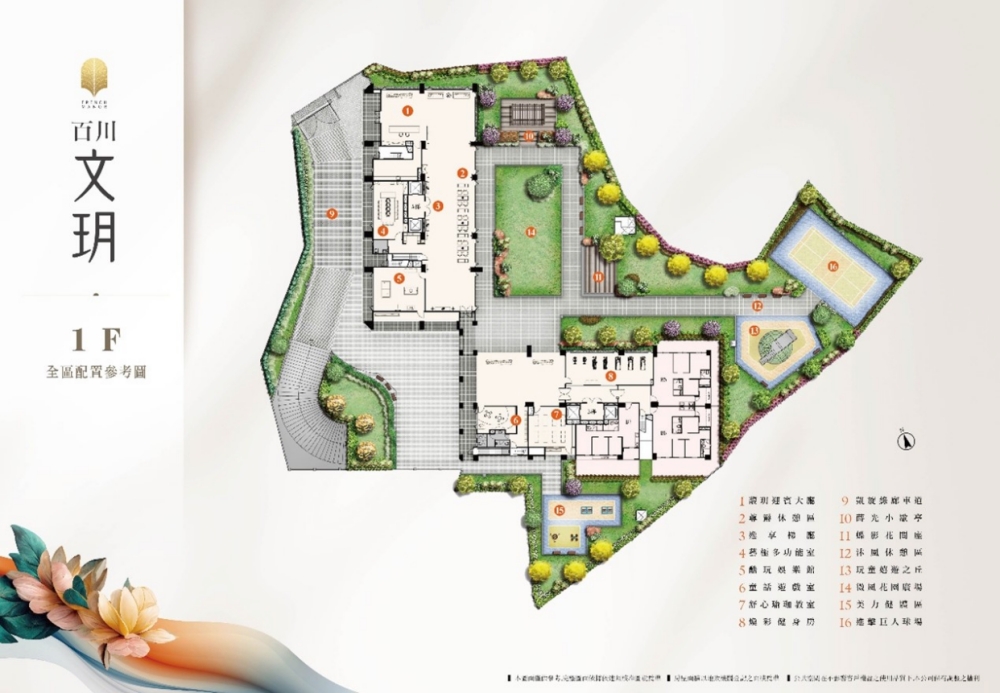 全案設計則以法式輕古典莊園為概念,打造如同「公園裡的住家」。2大棟建築之間的中庭種植了豐富多樣的綠意植栽,並且在室內外規劃了包括學齡前兒童遊戲區、能讓青少年運動的硬鋪面綜合球場、適合長青族活動的體適能區等,多達16項的全齡化公設,形塑兼具休閒、運動與社交機能的居住環境。