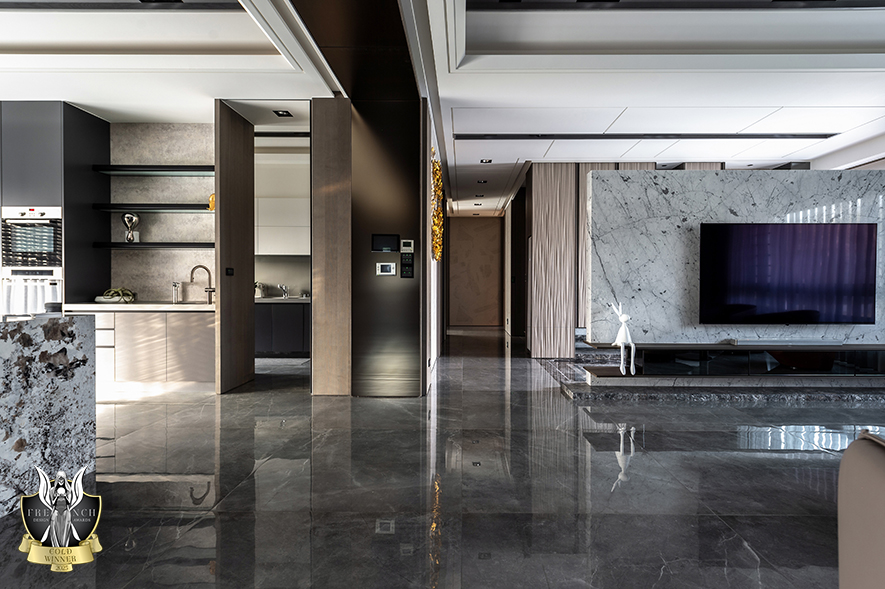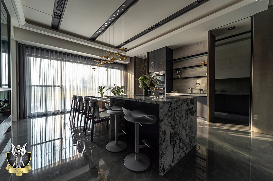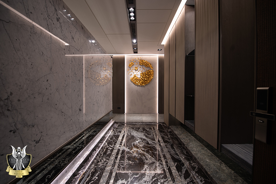鄭敏娥、楊竣傑 於三代同堂度假宅《雲栖海映》中,以一樓玄關、二樓梯廳為中軸線,對稱劃分公私領域,清楚區隔主客動線,同時藉由開放式公區及全套房配置,回應屋主招待親友的社交需求;其中一樓多功能次臥搭載掀床、臥榻與隱藏式滑桌,既可供多人通鋪留宿,亦能作為窗畔品茗觀景的起居角落。美學鋪陳層面,玄關處金色蝴蝶端景隱喻家族凝聚和擴展,搭配滑門飛鳥芒草、床頭花卉浮雕與魚群洄游等自然語彙,引領戶外綠意悄然滲入屋內;長遠考量上,設計師揀選耐候金屬、低甲醛綠建材及無障礙地坪,結合一、二樓雙主臥規劃,妥善構築屋主退休後安全無毒、行動無礙的宜居場景。細膩呼應使用者情感與實用所需的雋永之作,高度契合賽事對「創意、功能性與長遠影響」的評選要求,獲得本屆French