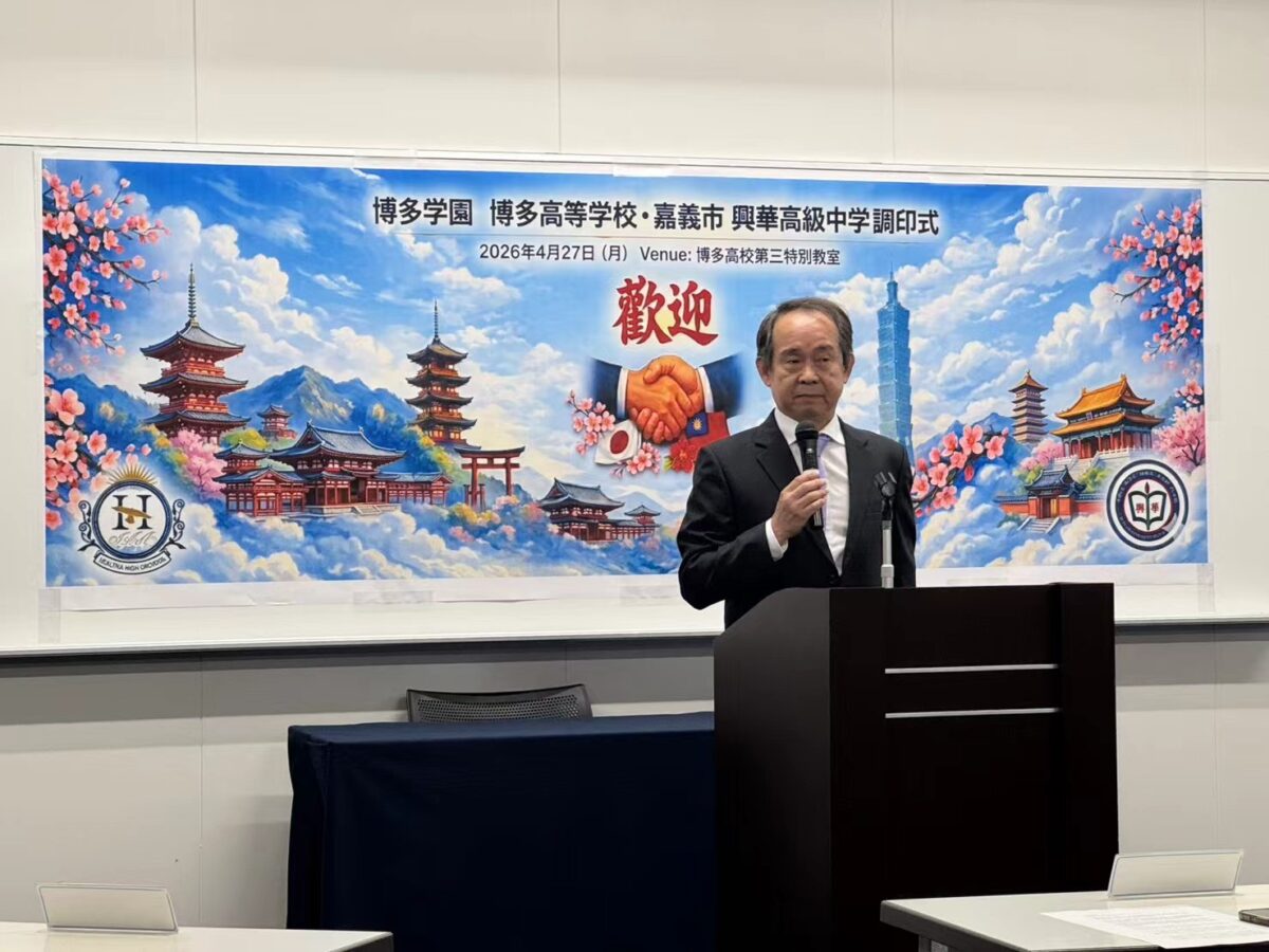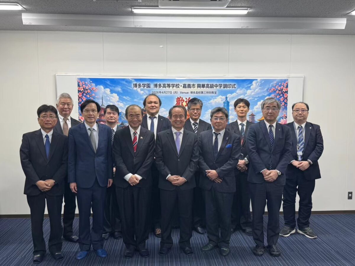 2026年4月27日,興華中學隸屬王宇集團,由榮譽董事長王崇旭及三位興華顧問:林志鴻台灣貿易中心福岡事務所所長、德島大學金成海教授、九州台灣未來研究所隈本直樹理事,親赴日本出席姊妹校簽約儀式,受到博多學園八尋董事長、檜垣校長、鶴屋教務主任、池田老師及多位主管與教職員高規格接待。雙方於隆重儀式中完成簽署,並就未來一個月交換學生、教師互訪、線上共備課程及升學輔導交流等項目進行深入會談,氣氛熱絡。