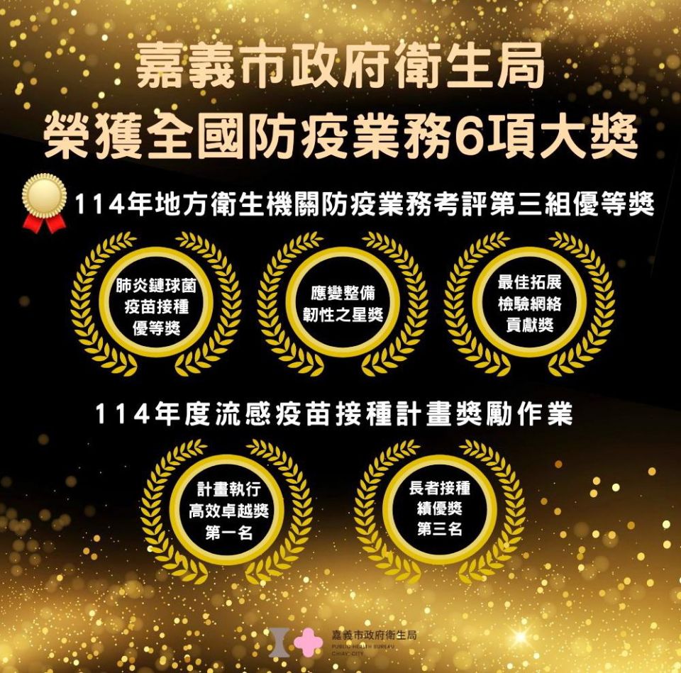 在新興傳染病應變整備方面榮獲「應變整備韌性之星獎」;檢驗量能強化方面榮獲「最佳拓展檢驗網絡貢獻獎」;在疫苗接種推動方面,榮獲「肺炎鏈球菌疫苗接種優等獎」及114年度流感疫苗接種計畫獎勵作業「計畫執行高效卓越獎第一名」與「長者接種績優獎第三名」,共計6項獎項,充分展現嘉義市在防疫整備、檢驗量能強化及疫苗覆蓋率提升上的優異成果。
