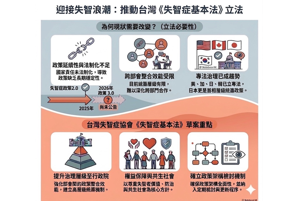 台灣失智症協會理事長徐文俊指出,我國歷經多期政策推動,發展背景與日本相近,現階段已具備邁向法制化的條件,實有必要加速推動專法制定,以確保政策的穩定延續並強化整體治理效能。