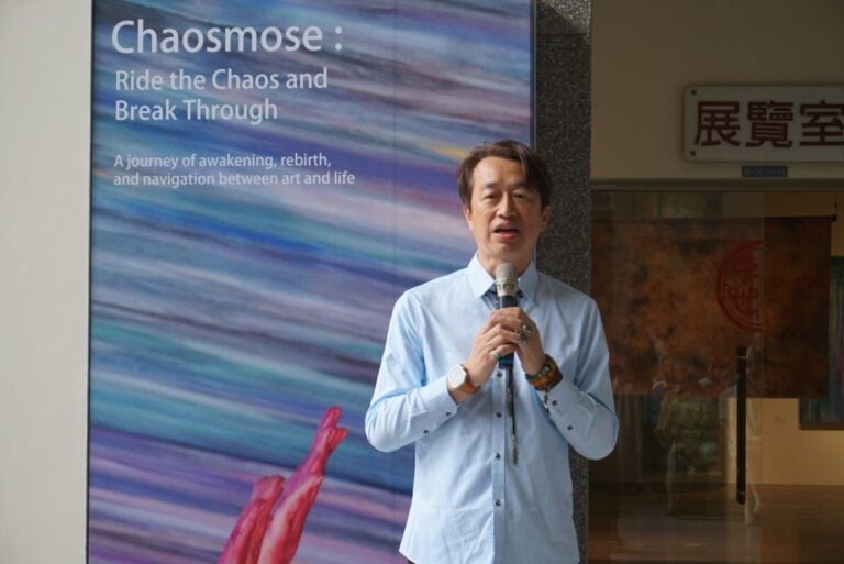 ▲藝術家Lynn Hyeong分享創作理念,表示藝術對他而言,是透過手與整個身體,直接與畫布、物質及環境互動的實踐。(記者劉峻文攝)