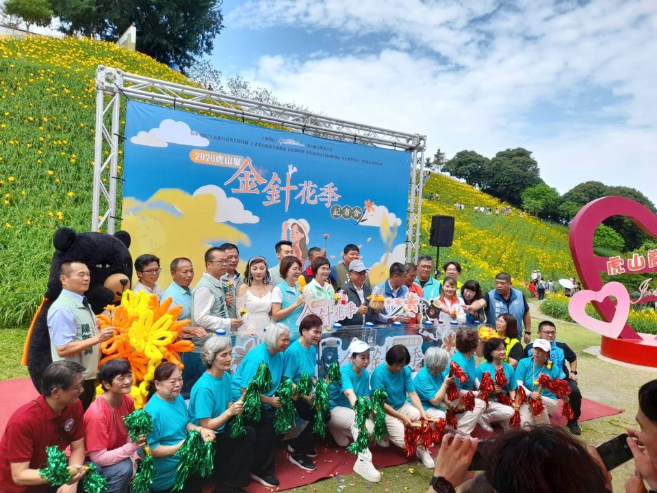 (記者曾厚銘/彰化報導)彰化花壇虎山巖金針花爆開,連日賞花遊客湧入,交通部觀光署參山國家風景區管理處與虎山巖寺管委會今(28)日舉辦金針花季記者會,在超過20萬朵金黃花海映襯下正式揭開賞花序幕,宣告今年母親節全台最具代表性的觀光亮點。參山處處長曹忠猷說,金針花爆開,接連五一連假與母親節假期都有最美的花況,到七月都是花季,歡迎大家到虎山巖欣賞美麗的金針花。