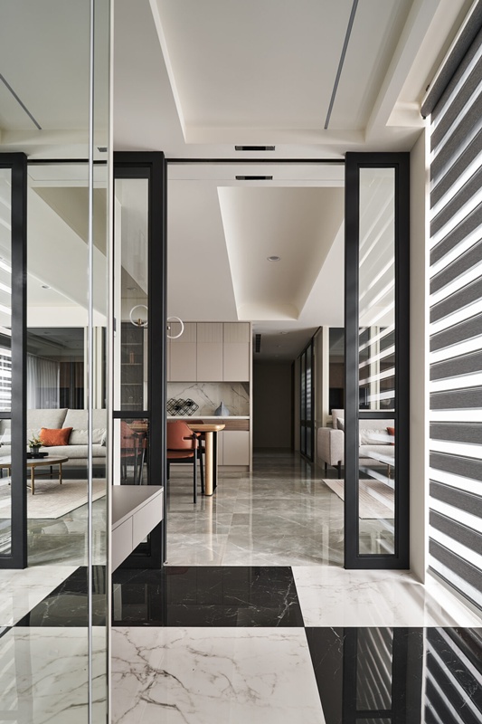 - 前衛迎賓:玄關地面以金鑲玉大理石與灰色薄石板拼貼,如琴鍵跳動,勾勒出獨特的視覺韻律。
