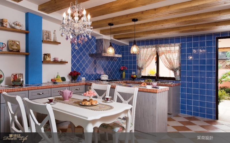 旅居巴拿馬多年的采荷設計師尤其擅長多色彩的異國風格規劃,餐廳與廚房的空間以歐式鄉村風中常見的斜屋頂設計,並利用了中島檯面作為與餐廳的分隔點,為了進貼近年輕屋主的性格,餐廚空間,以木作櫃體手染銀藍色更貼近年輕屋主的性格,木頭天然的紋理營造出自然氛圍,也使得樸質的鄉村空間變得更具現代色彩。地板的雙色地磚和華麗的水晶吊燈,混搭出了一種強烈的視覺效果。華麗的水晶吊燈具,可以平衡木頭的樸質感,更表現了西班牙式居家空間中優雅纖細的視覺享受。