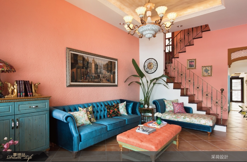 此設計案為約50年的老屋,經由屋主祖父傳承下來的祖厝,老舊的房舍透光不佳,樓板及格局矮小,已經不符現代人的居家使用習慣,因此采荷設計以開放式格局設計,拉高樓板引入自然光線,並將樓梯外露使空間更具整體性,利用西班牙式色彩搭配,賦於這間經歷了半世紀的老屋,新的語彙及生命,更符合傳承的下一代居家生活方式。