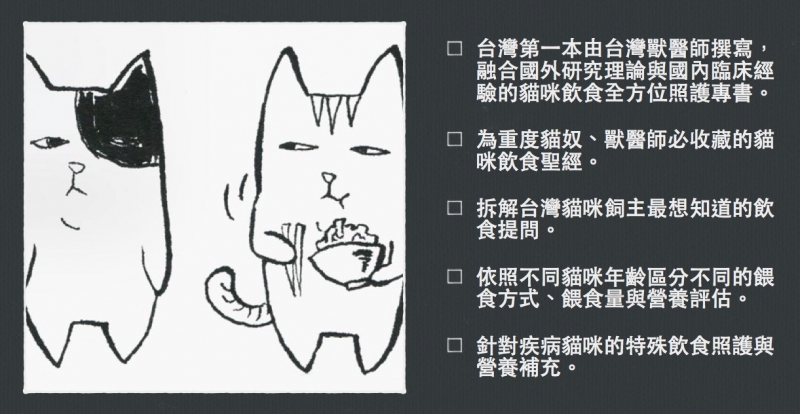 ・第一本由台灣獸醫師撰寫,融合國外研究理論與國內臨床經驗的貓咪飲食全方位照護專書。