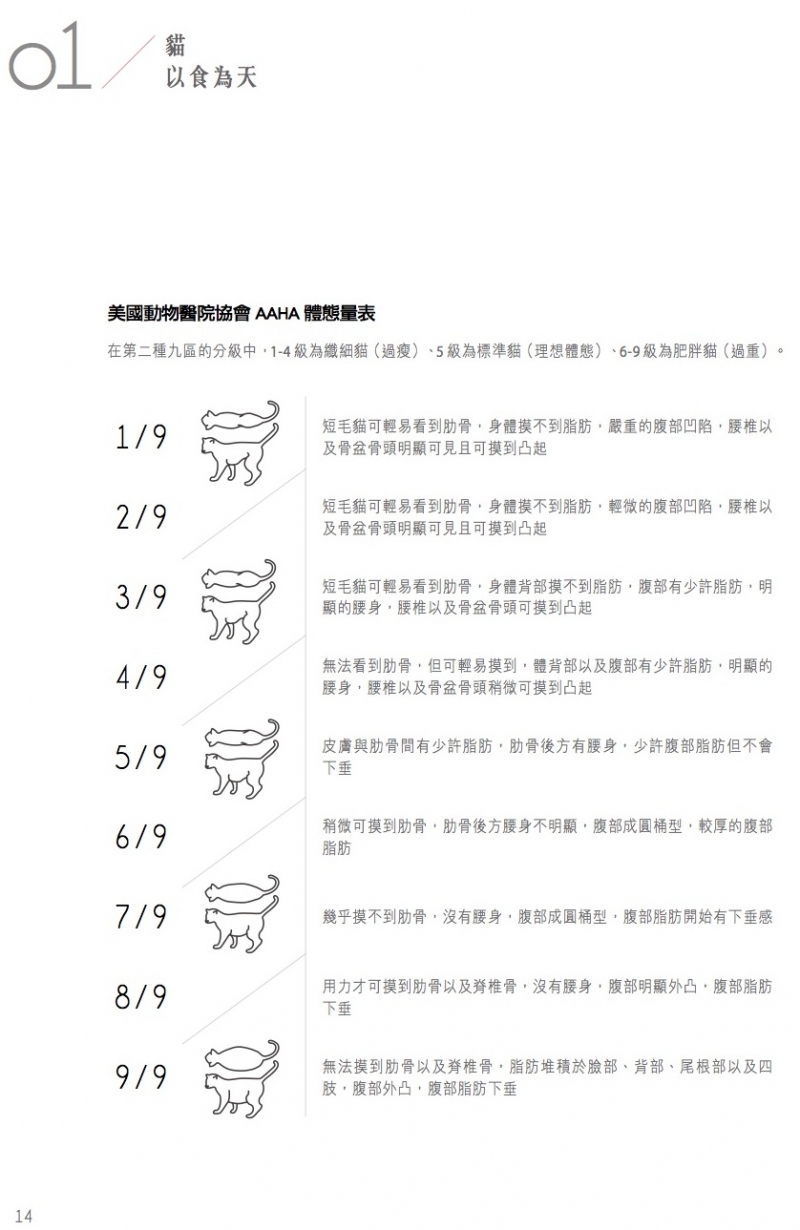 從瞭解貓咪的基本飲⻝需求開始,搞懂你的貓咪需要吃多少?怎麼吃?水分攝取與飲食禁忌是什麼?飼料、罐頭、鮮食或⽣食哪種好?從看懂飼料標示與成分開始,依照貓咪的年齡、健康狀況給予最正確的飲食規劃與營養品、保健品補充。