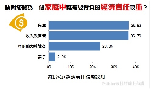 結果顯示,多數民眾認為一個家庭中「先生」或「收入較高者」,應背負較重的經濟責任,但其實超過六成民眾認為家庭經濟責任並不侷限於先生或是太太身上,而是由收入高、理財強的人負責,也就是說,以男女作為家中事務分工的模式,已經不是唯一的方式,反而以每個人擅長的項目分配家中工作,將更有效率,故雖然過往男主外女主內的刻板印象,尚未全盤改變,但隨著時代演進,以性別為基礎的分工狀況,將可能會逐漸減少。