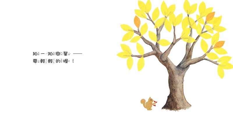 這不僅只是一本關於四季變化的美麗繪本,也是一本好玩的互動遊戲書,以一棵大樹為主角,讓孩子跟著大樹一起經歷春夏秋冬!畫面從一棵光禿禿的大樹開始,跟著簡單的指令輕輕點一次,翻到下一頁,一片葉子出現在樹梢;再繼續點,一、二、三、四,下一頁就增加了四片葉子,葉子愈點愈多、愈點愈多;再搓一搓大樹,樹長出了花苞;搖一搖大樹,蘋果咚咚落下;呼呼吹一口,像秋天的風一樣讓葉子飄落;拍拍手,雪花片片;閉上眼睛數到十,春天又再度降臨……