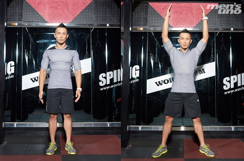 向上跳躍同時兩腳打開、兩手於頭部上方,再跳躍回到立正姿勢。