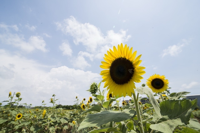 深入向日葵園,藍天白雲襯著大片黃綠色,畫面充滿夏季的熱力。