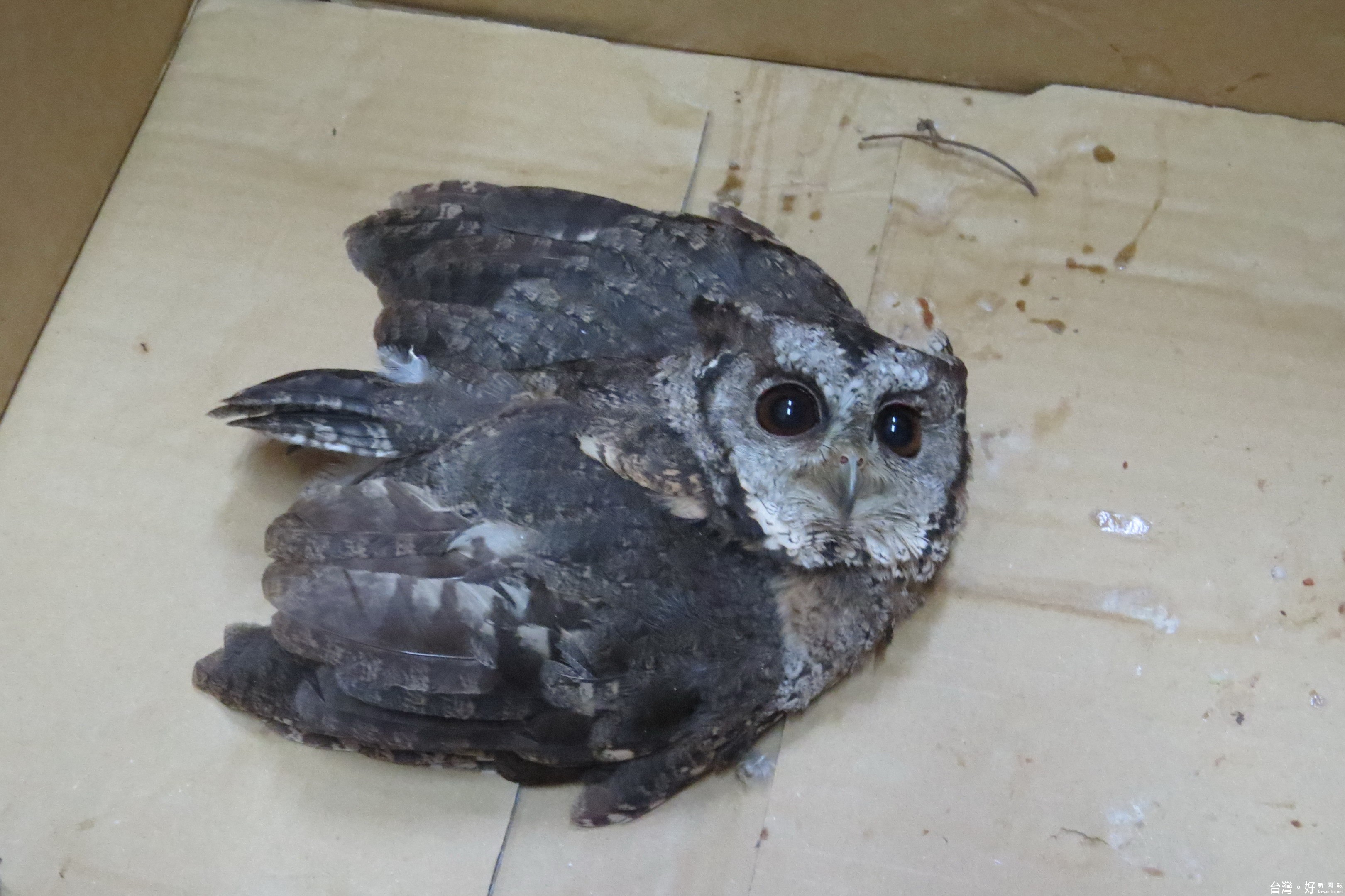 圖說: 圖為中度颱風發生二級保育貓頭鷹領角鴞吹落卡車上被救護情形。(記者邱仁武╱攝)
