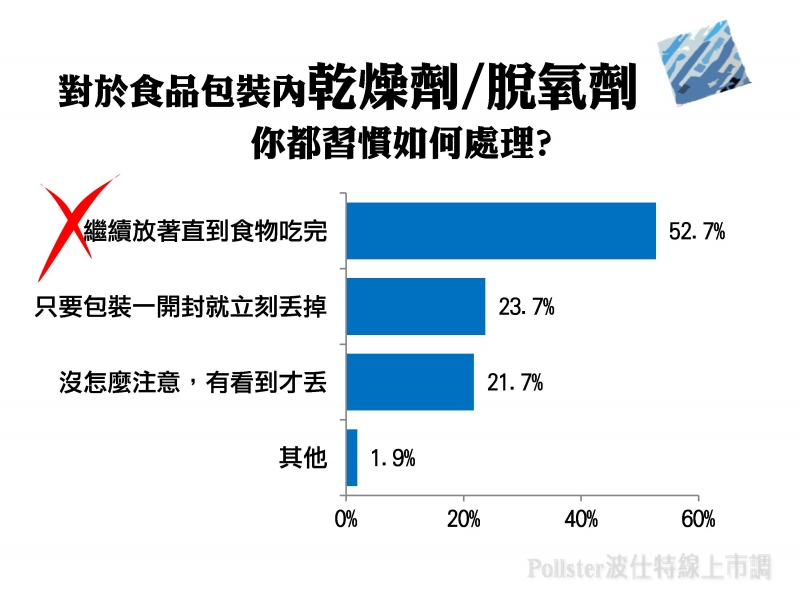 根據Pollster波仕特線上市調網針對「對於食品包裝內的『乾燥劑/脫氧劑』,請問您都習慣如何處理?」所進行的調查結果,以「繼續放著直到食物吃完」者占多數,約為整體受訪者之52.7%,其次為「只要包裝一開封就立刻丟掉」23.7%,而「沒怎麼注意,有看到才丟」21.7%則以微小差距緊追在後。由結果推測,民眾可能認為即便在食物開封後,「乾燥劑」仍具備吸收多餘水氣的功用,因此高達半數之比例選擇繼續保留「乾燥劑」,而不會立即丟棄。不過事實的確是如此嗎?