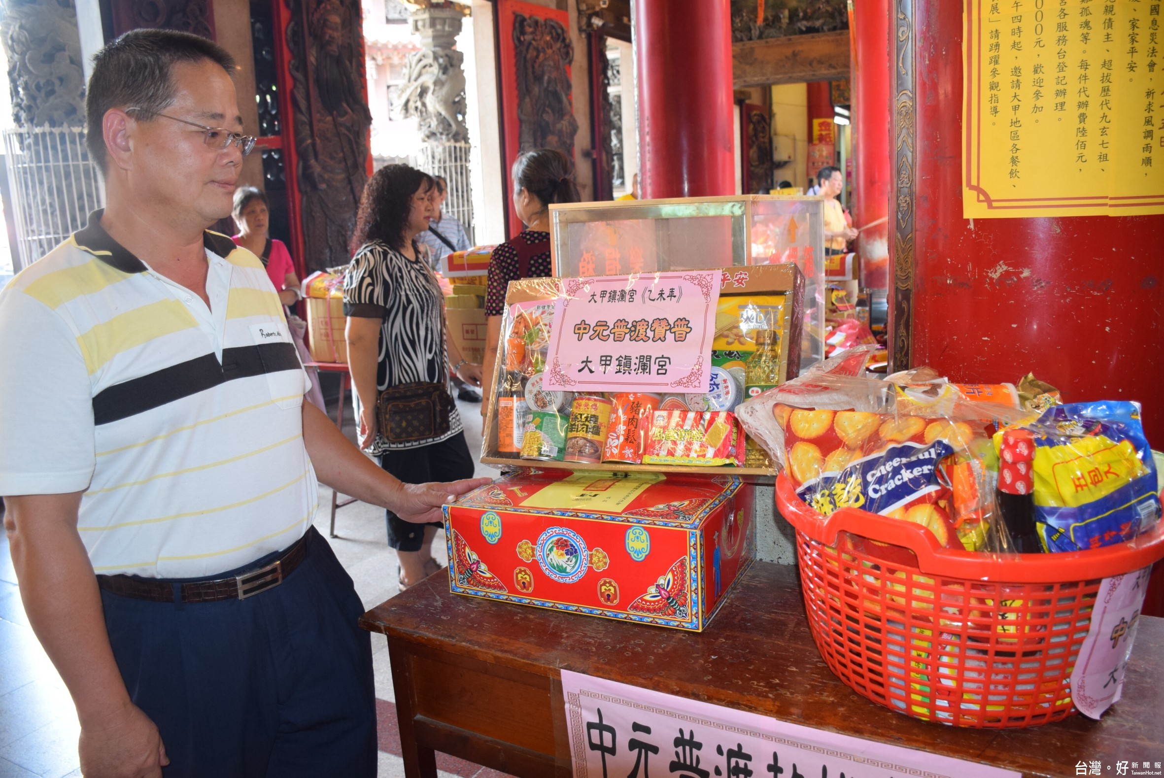 圖說:大甲鎮瀾宮為方便信眾在鬼月辦理祭品之不便,推出豐富的乾料食品祭品,在中元普渡獻祭。〔記者陳榮昌攝〕