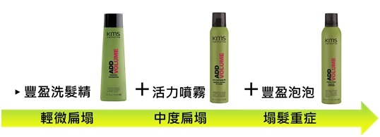▲不管妳是輕微扁塌,還是塌髮的重症患者,KMS豐盈系列針對不同髮況對症下藥!