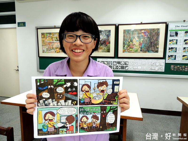 許碧育同學說,這次得獎的作品是以電子帳單為主題,因為每年到了要報稅的時候,大家就會拿了一堆帳單到國稅局報帳,如果全部改成電子帳單,就能減少紙張消耗,則可減少樹木砍伐,呼籲大家為了環保減少樹木被砍伐以愛地球,就請改使用電子帳單,為保護地球盡一份心力。