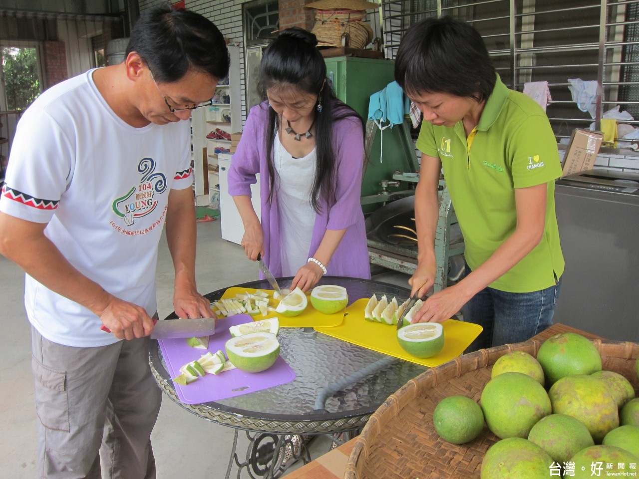 林洋毅的柚子園與其他農友一樣損失慘重,難過了一陣後,他珍惜撿回地面上的柚子、香蕉、芭樂及檸檬等,洗淨堆積在家中風乾一週,14日與遊客分享動手DIY製作「水果酵素」的樂趣。