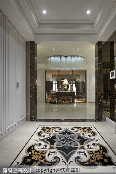 1.【圖說】玄關地坪設計精緻繁複拼花,視線端景設計華麗燈飾及擺設裝置,展現氣派與美學兼具的美式新古典迎賓禮讚。