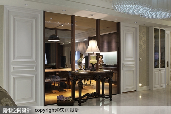 2.【圖說】玄關端景藉由茶玻隔間,內部為多功能會議室,入口刻意打造美式新古典白色對稱線板門。