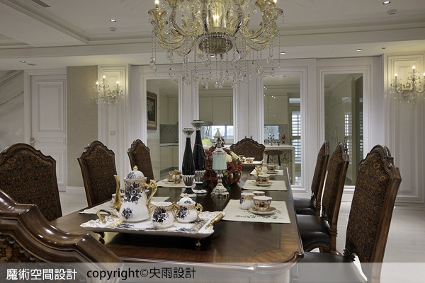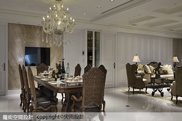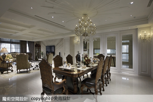 3.【圖說】央雨設計保留公共領域的寬暢,客餐廳不隔間僅以天花板做分野,餐廳以水晶燈為中心,營造光芒四射的天花線條。