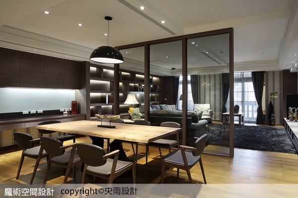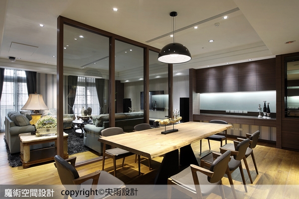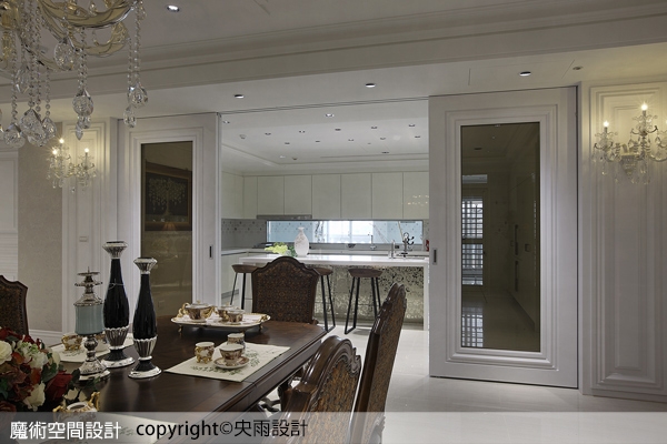 5.【圖說】緊鄰廚房的面向,對稱壁燈烘托四扇玻璃推拉門,藉由穿透式隔間適度將廚房光線引進餐廳。