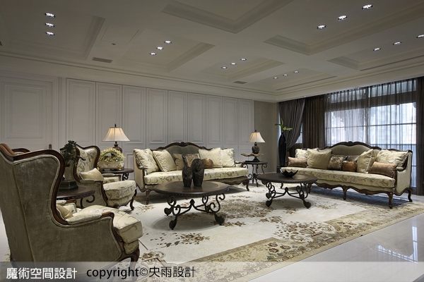 9.【圖說】客廳天花以立體格狀勾勒線板,將簡約元素融入美式新古典風格,呼應整體優雅調性。