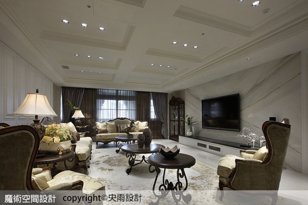 4.敞朗的客廳在典雅家具烘托下氣質溫婉,沙發背牆以連續美式新古典門板表現,兼具收納機能,寬幅大理石對花鋪陳電視主牆,展現豪宅氣宇非凡的大器風華。